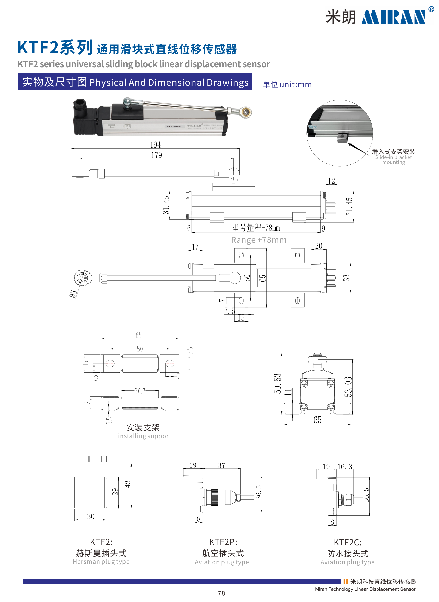 Application: KTF1 slider displacement sensor is a general installation of miniaturization, especially suitable for reducing the mechanical length direction of the installation size, suitable for large stroke type applications, such as: large injection molding machine closing stroke, rubber machine closing stroke, woodworking machinery, hydraulic machinery.