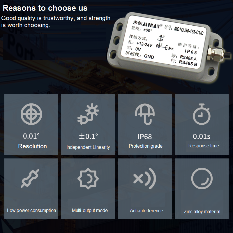 It is particularly worth mentioning that the latest six-axis dynamic tilt sensor launched by Miran Technology adopts non-contact measurement and can output the current attitude tilt Angle in real time. It is easy to use and integrates high-precision AD and gyroscopic units internally. It can compensate for nonlinearity, orthogonal coupling, temperature drift and centrifugal acceleration in real time, which can greatly eliminate the centrifugal error caused by the interference of motion acceleration. Improving the dynamic measurement accuracy of the product enables it to adapt to operation in complex motion scenarios and harsh environments for a long time. This product is a dual-mode dynamic and static measurement sensor with strong resistance to external electromagnetic interference. It is suitable for various large-scale, high-intensity shock and vibration industrial environments and is an ideal choice for measuring posture in industrial automation control.