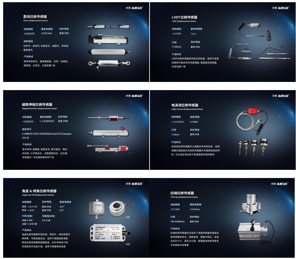 These products fully demonstrate the achievements of Miran Technology's over 20 years of technological accumulation. The displacement sensors produced by the company hold the top market share in the niche field. The linear accuracy of its magnetostrictive displacement sensors can reach less than 0.05%FS, the repeatability accuracy is as high as ±0.005%FS, and the highest protection grade is IP68.