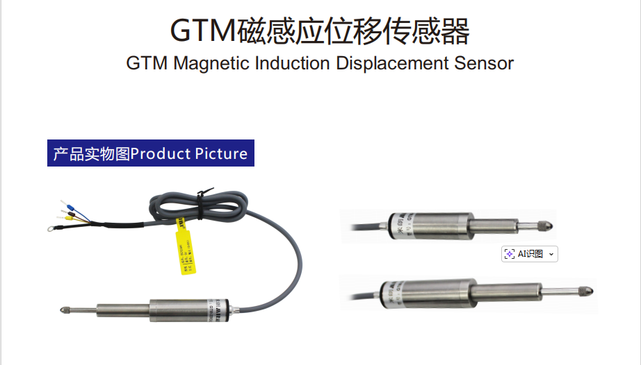 GTM系列是米朗公司自行研发生产的新款弹簧自复位型的位移传感器,采用的是微型霍尔磁感应原理,是一款非接触式霍尔磁感应传感器,内部采用感应磁缸和单片机芯片处理电路两部分,内部磁缸来回伸缩,电路中的霍尔磁感应编程芯片产生磁性感应,通过内部处理电路输出不同的模拟量(电流/电压)或数字量(RS485)信号,输出信号的大小值与实际位移距离呈正比例线性关系。